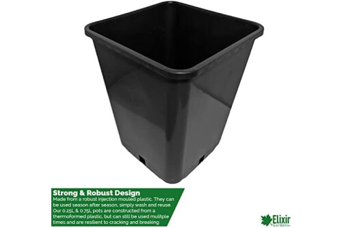 We stock many sizes of black square pots, from 0.25 L up to 11L. Please note: Our 0.25L (7cm) and 0.75L (9cm) varieties are constrcuted from a slightly thinner thermoformed plastic and are predominantly designed for seedlings.
