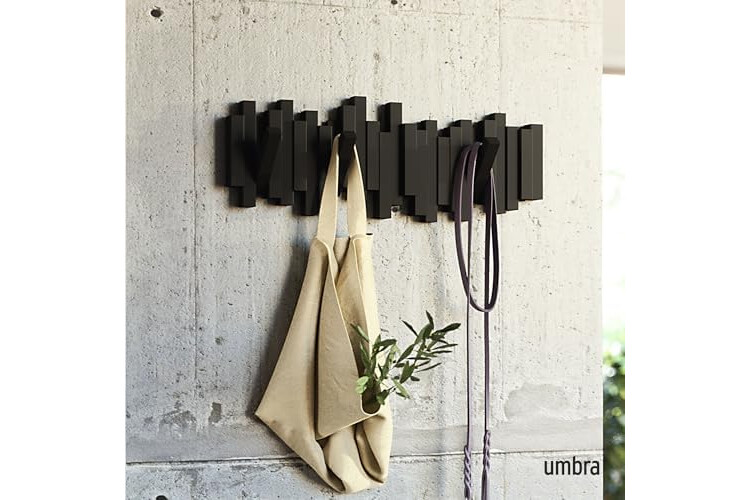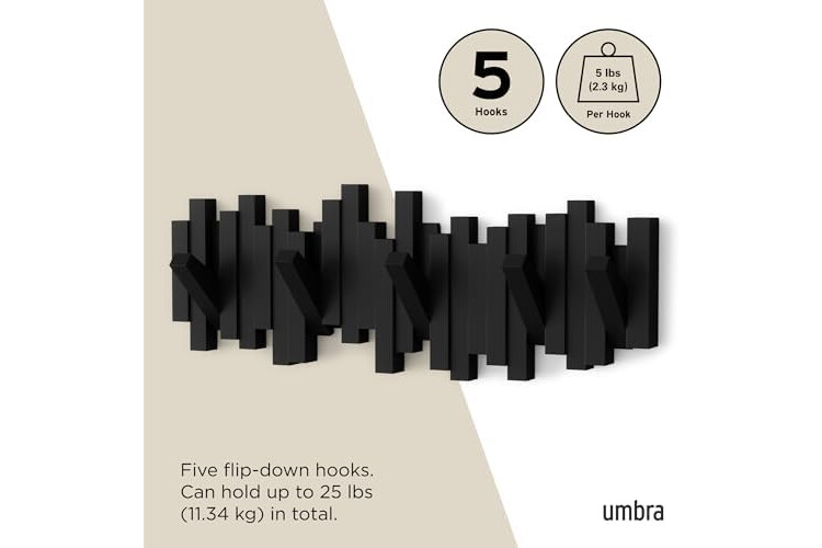 MODERN & FUNCTIONAL: Sticks Multi Hook Coat Rack is a unique wall mountable coat rack, hat rack, and clothing rack that provides 5 flip-down coat hooks and ample hanging space for your entryway, bedroom, office or dorm room.