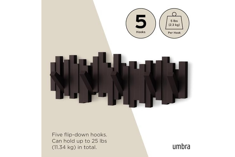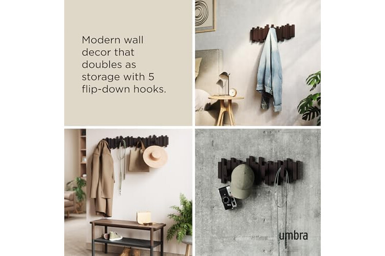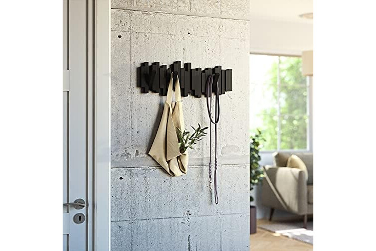 MODERN & FUNCTIONAL: Sticks Multi Hook Coat Rack is a unique wall mountable coat rack, hat rack, and clothing rack that provides 5 flip-down coat hooks and ample hanging space for your entryway, bedroom, office or dorm room.