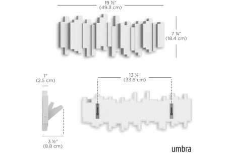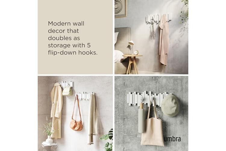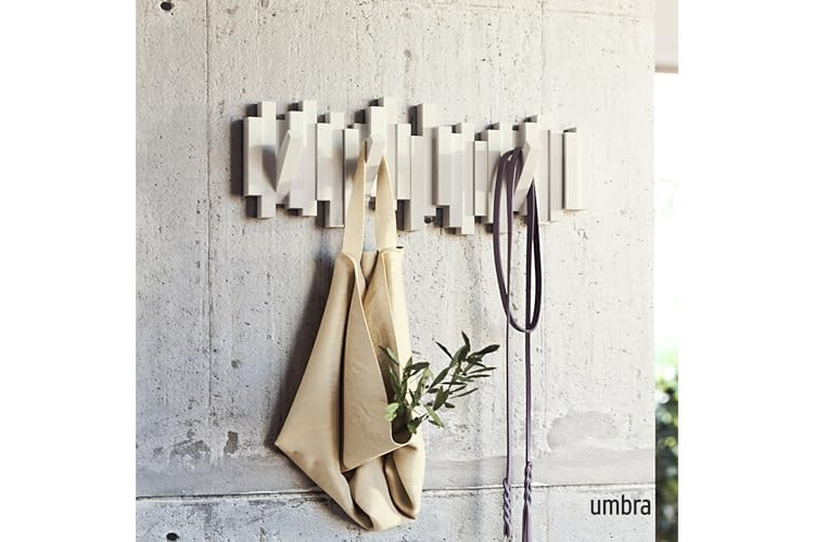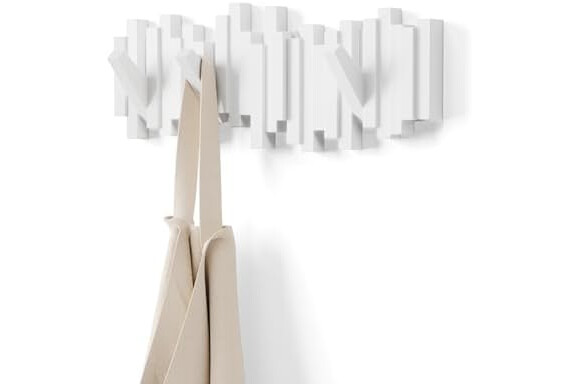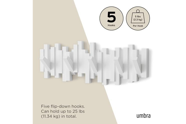 Umbra Sticks Multi Hook Coat Rack - Modern, Unique, Space-Saving Wall Mounted Coat Hanger with 5 Flip-Down Hooks for Hanging Coats, Scarves, Purses and More, White,19-1/8" x 7-1/8" x 1-1/8" h