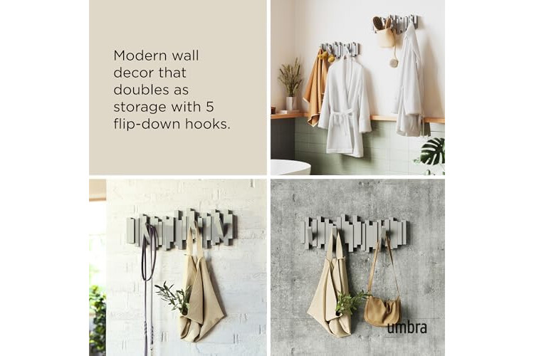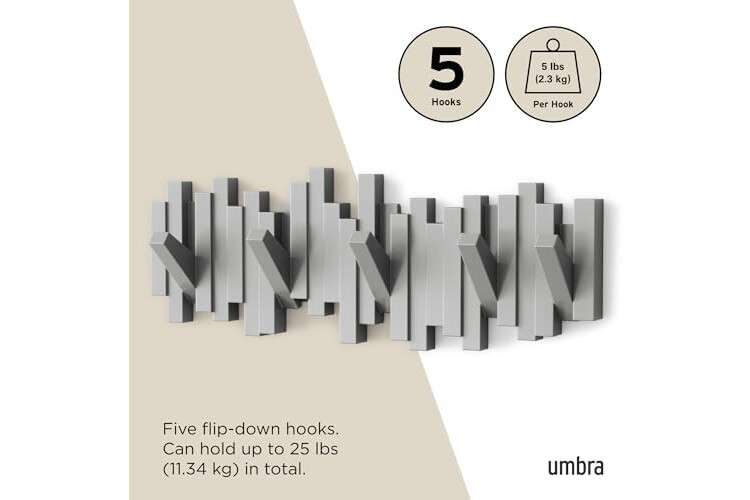 MODERN & FUNCTIONAL: Sticks Multi Hook Coat Rack is a unique wall mountable coat rack, hat rack, and clothing rack that provides 5 flip-down coat hooks and ample hanging space for your entryway, bedroom, office or dorm room.