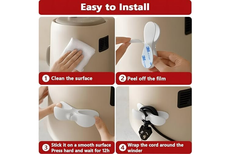 POWERFUL ADHESION: Our Cord Winder for Appliance is made of 3M Strong PE foam Adhesive, it Widen the contact area between the Adhesive and machine so that Cord Winder for Kitchen Appliances stick on Firmly. Our Kitchen Appliance Cord Wrapper is Tested so it will Not fall off. The Cable Organizer sticks to most surfaces including curved ones. (Please stick to clean, non-greasy surface, Its ready to use after application but waiting a few hours before use increases adhesion strength even further)