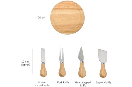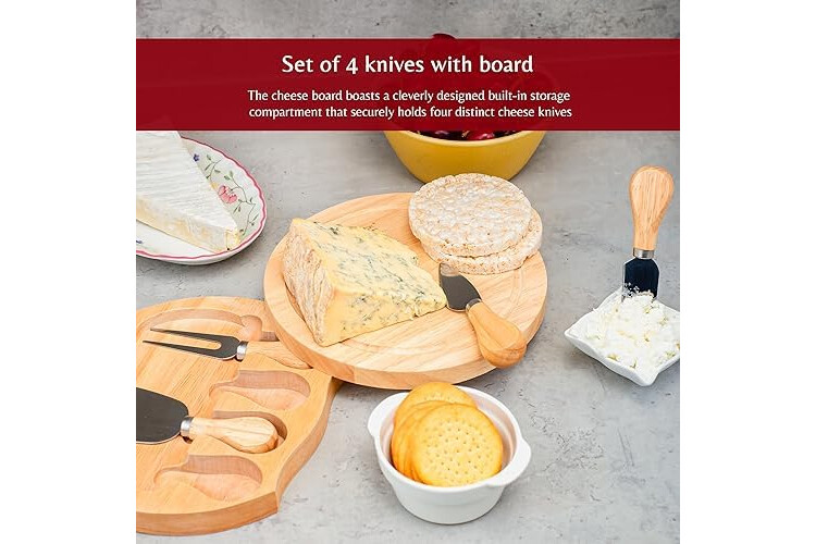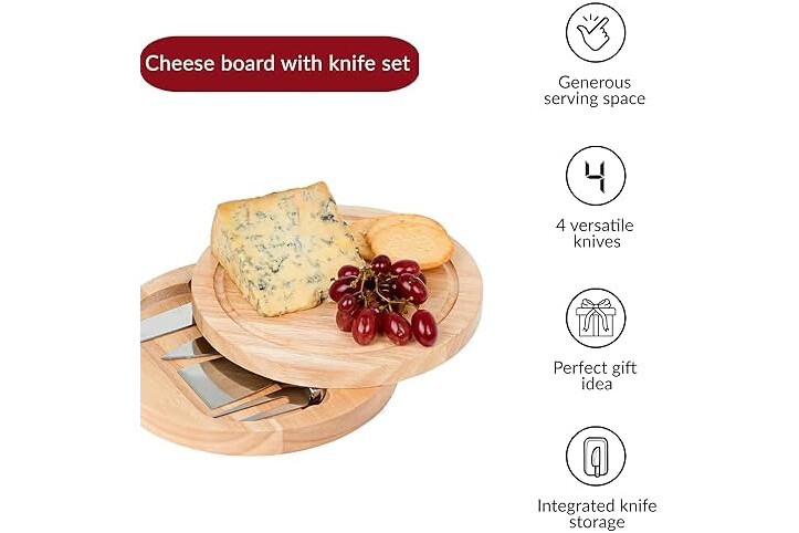 Innoteck Essentials Round Cheese Board with 4pc Set - Rubberwood Board for Cheese, Fruit, Vegetables, & Meat - Ideal for Picnics and Parties