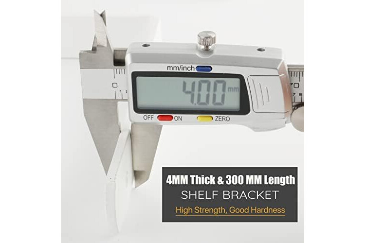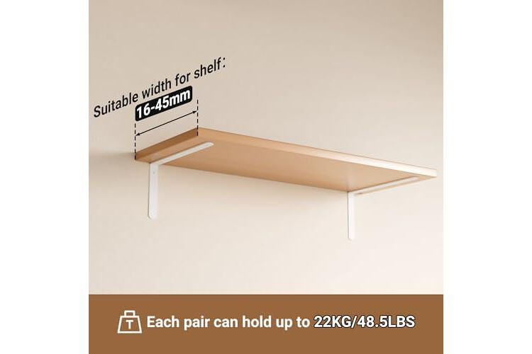 Each pair can hold up to 22KG/48.5LBS. Suitable width for shelf: 16-45mm. Product Dimension: 300mm x 155mm x 25mm(L*W*H), Hole Dia.: 6.5mm, Thickness: 4mm.