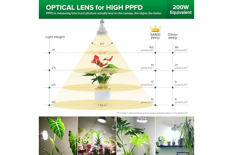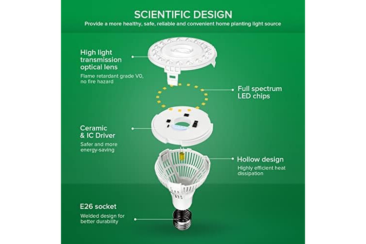 TWO WEEKS MAKE A DIFFERENCE: SANSI LED grow light bulb could simulates sunlike light and emits no-harmful natural white light to help your indoor plants grow faster and healthier. Recommended coverage area up to about 4.20 sq. ft. mounted 18”-24” above the plants. Just 2 weeks to witness the miracle growth for your plants.