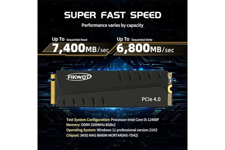 EXCELLENT PERFORMANCE - Fikwot FN970 1TB M.2 SSD adopts M.2 PCIe Gen4 x4 technology and is compatible with NVMe1.4 protocol. The maximum read speed of this SSD is as high as 7400MB/s, and the maximum write speed is as high as 5400MB/s. It is equipped with a dynamic SLC cache to effectively maintain the high-speed operation and stability of the SSD.