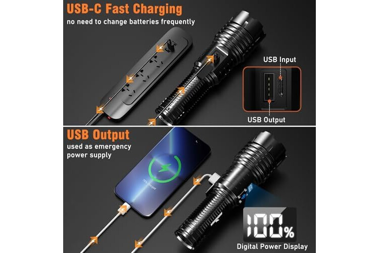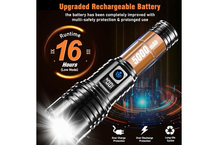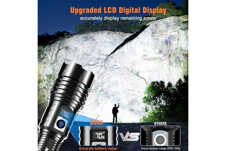 【LCD POWER DISPLAY | RECHARGEBALE TORCH | USB OUTPUT】: This led torch rechargeable has been newly upgraded with unique LCD power percentage display. At a glance, you can always grasp the remaining power. Besides, this torches battery powered has been completely improved to shorten the charging time and extend the service life, providing up to 16 hours (Low mode) of powerful, non-diminishing brightness. With usb interface, It's more convenient to charge. It can also charge the phone in emergency.