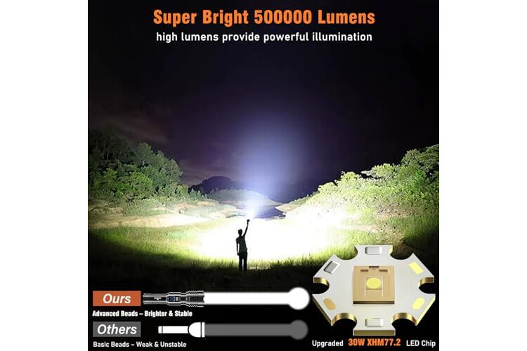 【TORCHES LED SUPER BRIGHT 500000L】: S1695 torch is equipped with an upgraded 2026 XHM77.2 chip and the light source is much more stable. Since the light penetration is stronger than other lamp beads', its beam can pass through the dust and fog well, comparable to car fog lamps, especially suitable for foggy and rainy days with low visibility. It can easily illuminate an 2160-square-foot room or focus on objects up to 3937 feet away. The led torch is the best gift for friends and family.
