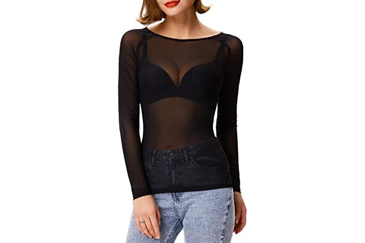 GRACE KARIN Womens Stretchy Scoop Neck Sheer See Through Sexy Slim Fit Mesh Tops Long Sleeves Blouse