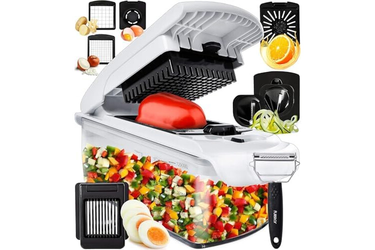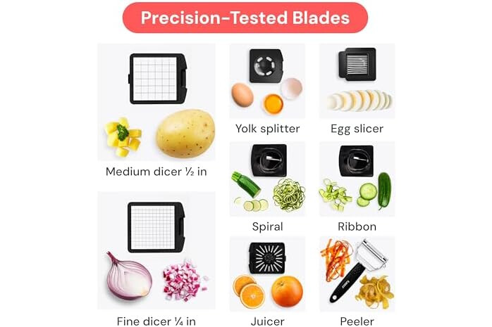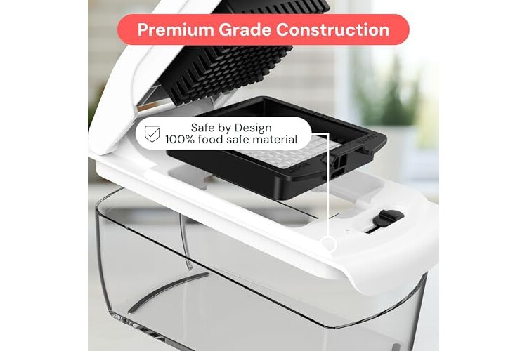 5-Star Design for Everyday Cooking – Built for comfort and precision. The soft-grip TPU handle offers better control, while the non-skid rubber base keeps this BPA-free food chopper stable on any surface. Its built-in catch tray keeps counters clean — making it a perfect house warming gift!
