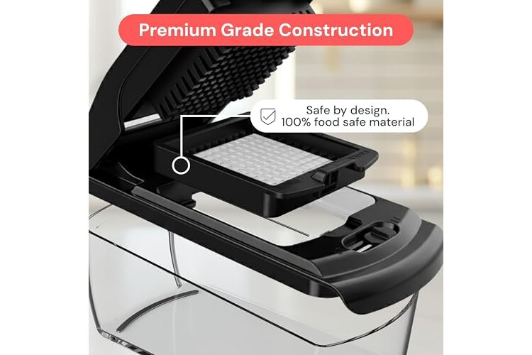 5-Star Design for Everyday Cooking – Built for comfort and precision. The soft-grip TPU handle offers better control, while the non-skid rubber base keeps this BPA-free food chopper stable on any surface. Its built-in catch tray keeps counters clean — making it a perfect house warming gift!