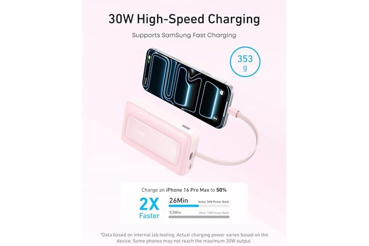 30W Two-Way Fast Charging: Charge quickly with 30W output and recharge just as fast with 20W input, keeping your devices ready in no time. Boost an iPhone 15 from 0 to 57% in just 30 minutes.