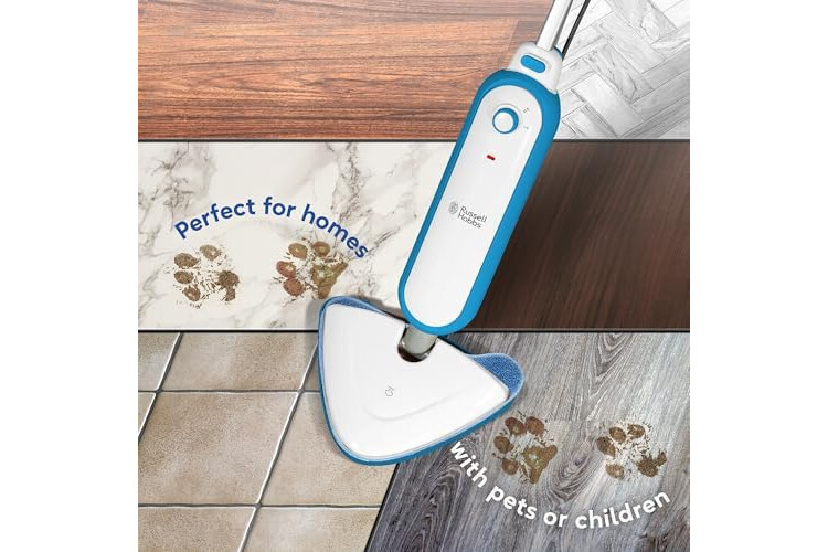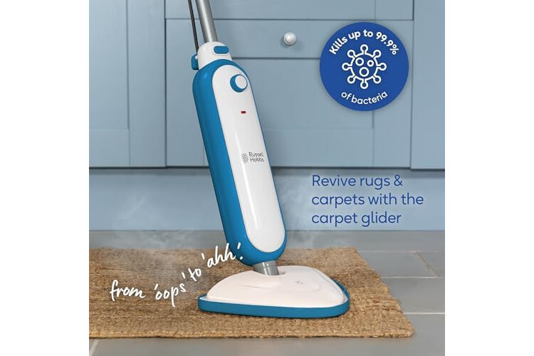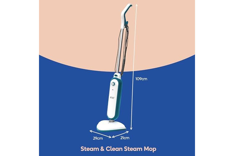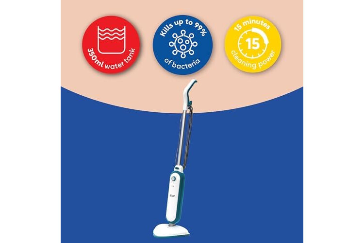 Russell Hobbs Upright Steam Mop, 1.4kW Power, 380ml Water Tank, 30-Second Heat-up, 15-Minute Run-Time, Sealed Hard Floors, Tiles, Vinyl Flooring, Carpets, Rugs in White & Aqua, RHSM1001-G