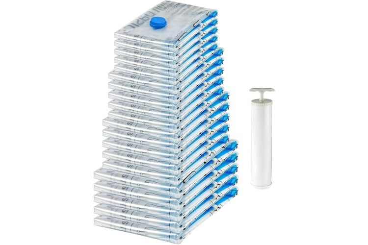 20-pack of compression storage bags in various sizes including XL bags for storing large items such as duvets, bed sheets, blankets, pillows and drapery; large and below-sized bags for small items such as off-season clothes, towels, linens and more