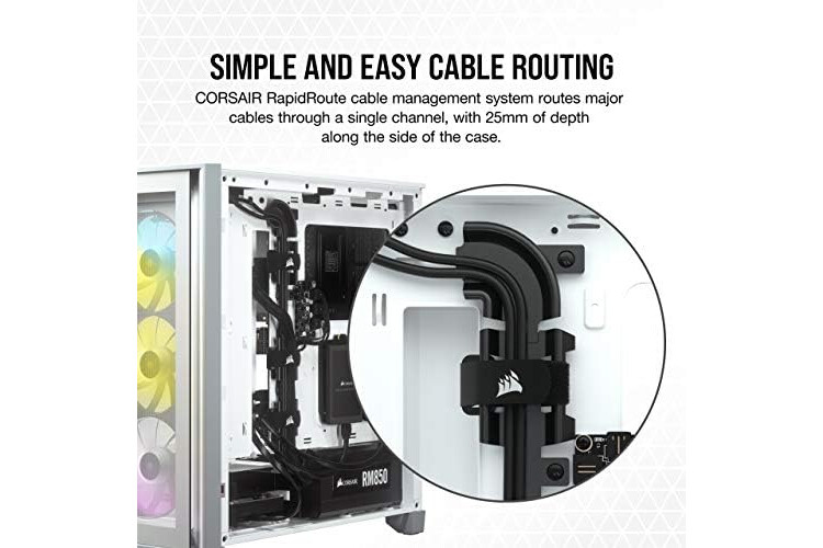 The CORSAIR RapidRoute cable management system makes it simple and fast to build an immaculate, professional-looking system with major cables neatly routed through a single channel, with a roomy 25mm of space behind the motherboard for all of your cables.