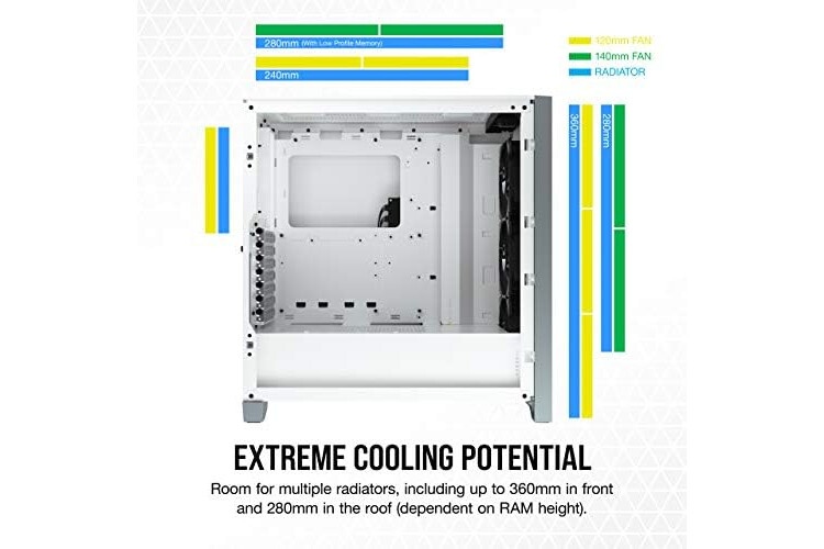 Includes 3 CORSAIR 120mm AirGuide RGB fans, utilizing anti-vortex vanes to concentrate airflow and enhance cooling. Each fan is equipped with eight individually addressable RGB LEDs for brilliant customizable lighting.