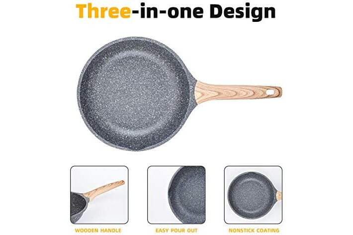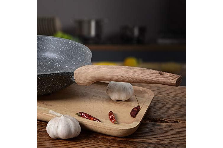 CLASSY & ELEGANT DESIGN - The stone frying pans’ streamlined design integrated with ergonomic wood grain handle adds to its comfort, convenience and slip resistance during cooking.