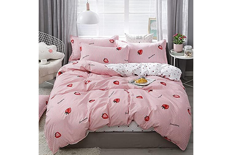 Strawberry Duvet Cover Set King Girls Cute Strawberry Heart Love Fruit Bedding Set For Kids Baby Girls Bedroom Decor Lovely Pink Stripe Comforter Cover Soft Reversible Kawaii Style Bedspread Cover