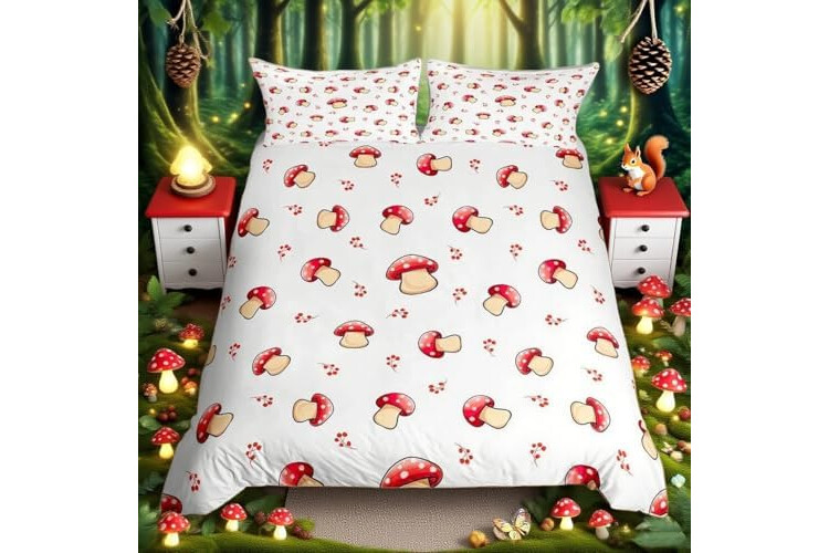 Mushroom Decor Duvet Cover Cute Mushrooms Bedding Set for Kids Boys Girls Teens Kawaii Cartoon Fungus Botanical Plants Decor Comforter Cover Red White Bedspread Cover with 2 Pillow Shams,King Size