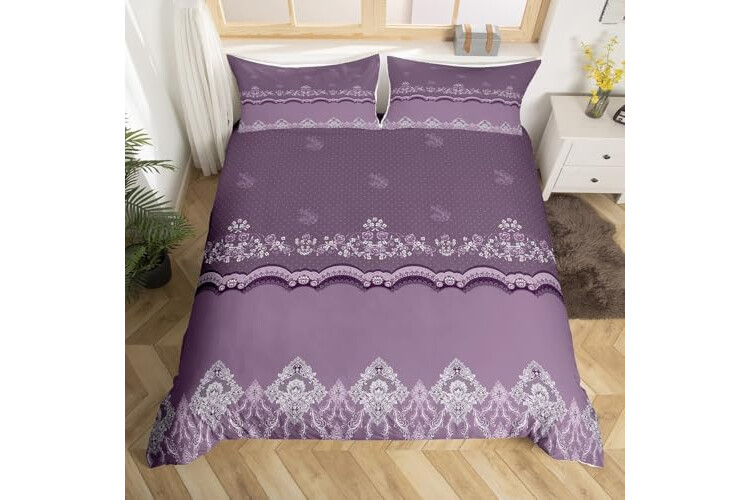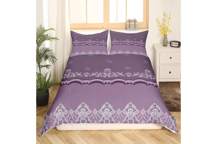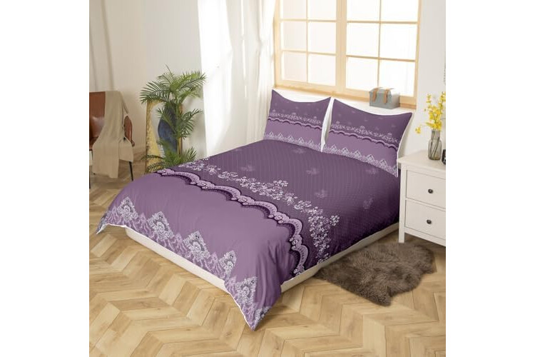 Double Duvet Cover Set Floral Lace Pattern Quilt Cover Set with 2 Pillow Shames Lightweight Soft Microfiber Classic Style Bedding Sets with Zipper Closure and Corner Ties,Purple Lace 3pcs (200x200cm)