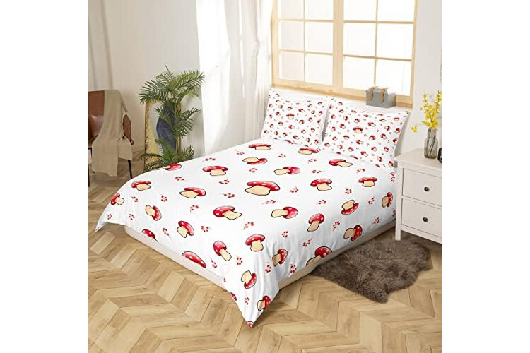 Mushroom Decor Duvet Cover Cute Mushrooms Bedding Set for Kids Boys Girls Teens Kawaii Cartoon Fungus Botanical Plants Decor Comforter Cover Red White Bedspread Cover with 1 Pillow Sham,Single Size