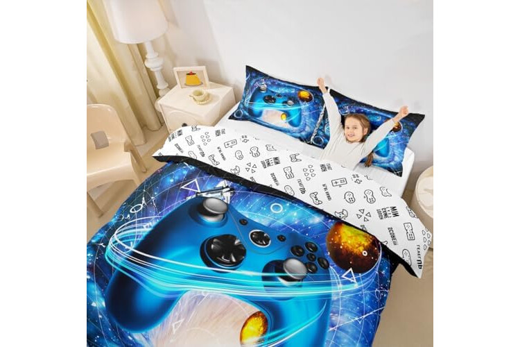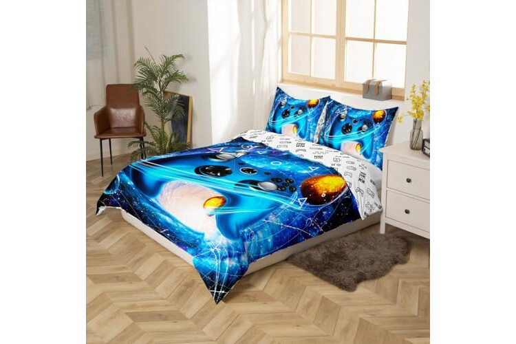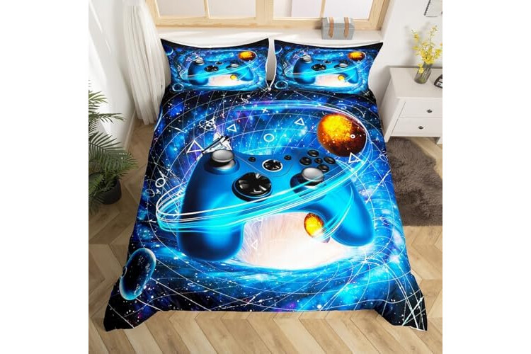 Boys Gamer Duvet Cover Video Gamepad Bedding Set for Kids Teens Adults Galaxy Player Gaming Controller Comforter Cover Glitter Games Blue Decor Bedspread with 2 Pillowcases 3Pcs Bedding Super King