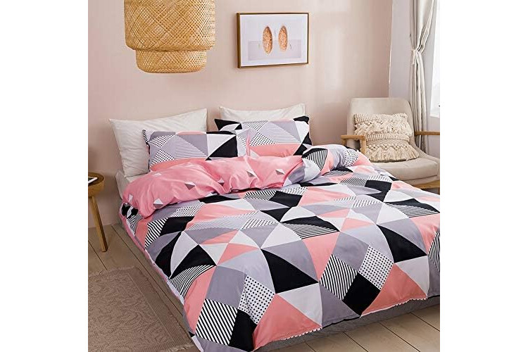Loussiesd Girls 3 Pcs Duvet Cover Double Size, Modern Geometric Triangle Pattern Bedding Set for Kids Adults Plaid Strip Bedclothes Grey Pink White Bedspread Cover Luxury Microfiber Bedding