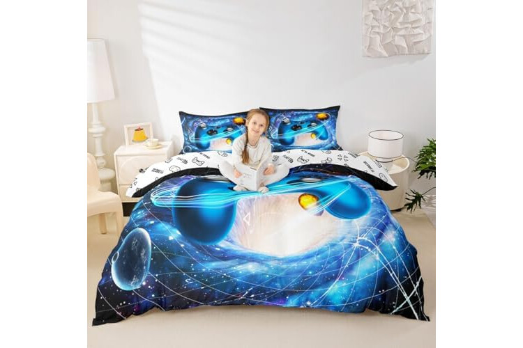 Boys Gamer Duvet Cover Video Gamepad Bedding Set for Kids Teens Adults Galaxy Player Gaming Controller Comforter Cover Glitter Games Blue Decor Bedspread Cover with 2 Pillowcases 3Pcs Bedding Double