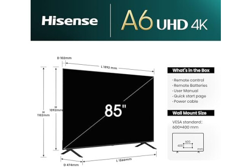 Hisense 85 Inch 4K Smart TV 85A6NTUK - Dolby Vision, Game Mode PLUS with 60Hz VRR ALLM, Smooth Motion, AI Sports Mode, Vidaa OS with Freely, Youtube, Netflix and Disney+ & Now TV (2024 Model)