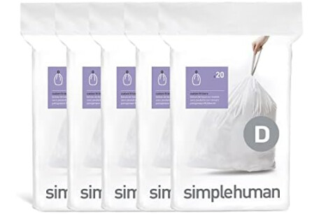 simplehuman Code D 100 Liners, 50% Recycled Custom Fit Bin Bags in Dispenser Packs, Durable Drawstring Tie Handle, 20L, White