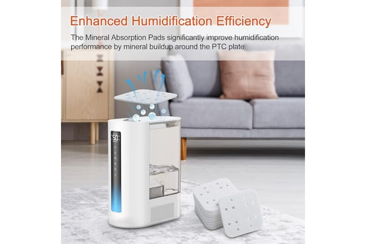 [BOOSTED HUMIDIFICATION PERFORMANCE] Experience improved humidification efficiency with our Mineral Absorption Pads that reduce mineral accumulation around the PTC plate, allowing for steady moisture release into your living space.