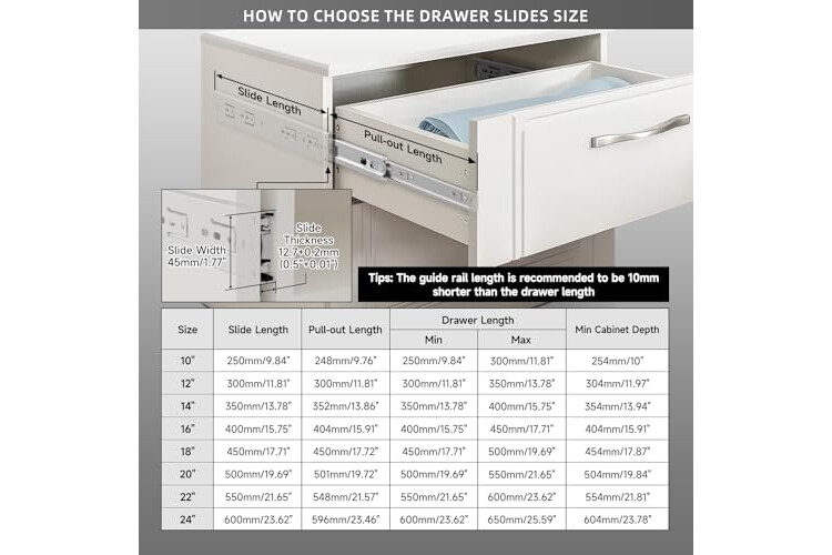 【Side Mount Drawer Runner】Quantity: 1 pair, mounting screws included.Length: 300mm(12 inch).You can choose the size of the rails according to the depth of the drawer. *The length of the slide should be ≤ the length of the drawer.installation clearance:12.5mm(Each).Easy to install.