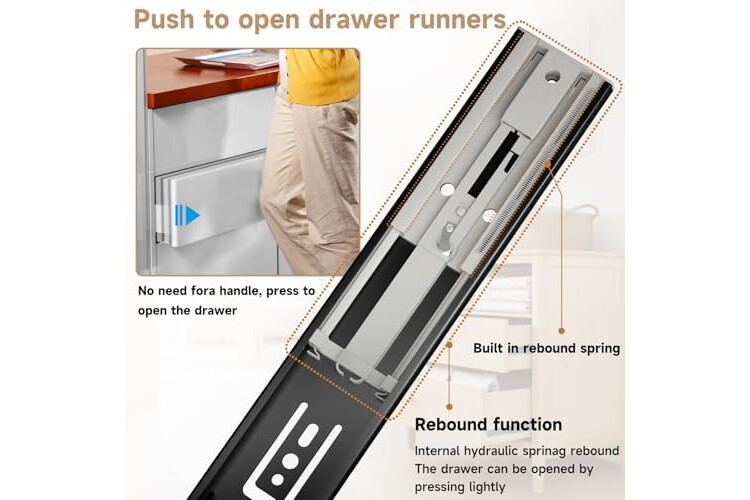 【Push Open & Detachable】This is push to open drawer runner, no need to pull hands. The drawer rebounds and slides open as soon as you touch it. There is a black plastic buckle on the back of the slide rail, and the drawer can be easily taken out by pressing it, easy to install. Available in sizes 300 350 400 450 500 550 600mm.
