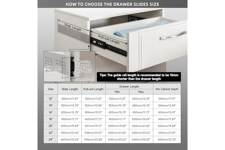 【Installation requirements】 Size:Length: 400mm(16 inch)— Fully extended length:800mm(32 inch).You can choose the size of the rails according to the depth of the drawer. *The length of the slide should be ≤ the length of the drawer.installation clearance:12.5mm/0.5 "(Each).Screws included.For the drawer with outer cover, please reserve 1cm buffer position on the inner side of the panel to avoid the normal use of the slide function that affects the drawer slides