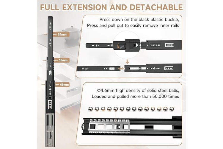 【Push Open & Detachable】This is push to open drawer runner ,no need to pull hands.The drawer rebounds and slides open as soon as you touch it,There is a black plastic buckle on the back of the slide rail, and the drawer can be easily taken out by pressing it, easy to install, available in sizes 300 350 400 450 500 550 600mm
