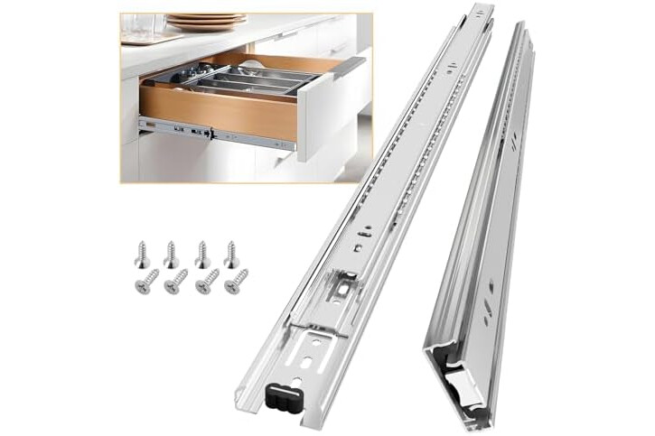 【Durable and Strong】 drawer runners are made of 1mm high-quality Q235 cold-rolled steel, width: 45mm, hold 100 pounds, 40 pounds more than regular runners, Passed more than 100000 opening and closing tests, 30 years service life