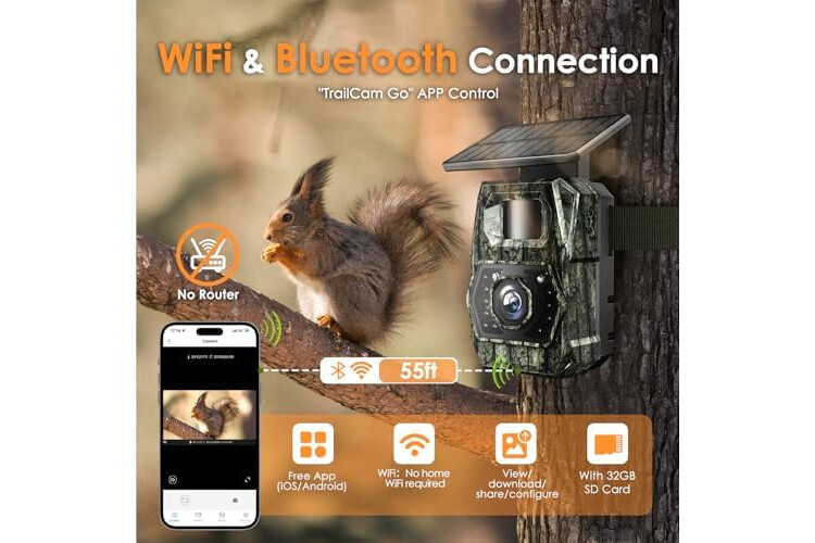 Wi-Fi Connection & APP Control: The wildlife camera with night vision motion activated is compatible with ultra-low-power Wi-Fi and Bluetooth technology and comes with a free and easy-to-use APP (TrailCam GO). You can connect the trail cam to your cell phone and preview pictures and videos via the app. Note: The WiFi connection range is a maximum of 55 feet (16.76 metres) without any obstacles in between. It does not support home WiFi connection.