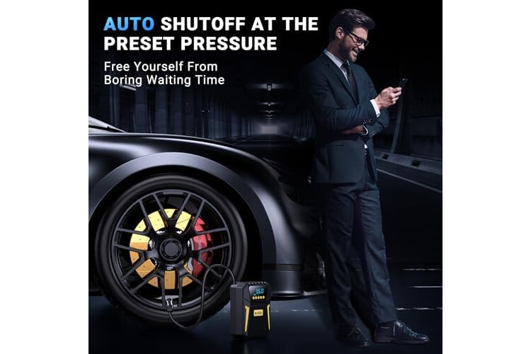【Preset Tyre Pressure & Auto Shutoff】: You just need to start the engine, plug the cigarette lighter into the car's 12V power outlet, link the tyres, press the‘Switch button’to select the mode, and then press the‘+’and ‘-’buttons to preset the required pressure.When the Portable tyre inflator reaches the required pressure,the digital air compressor will automatically switch off, so you don't have to worry about over-inflation.