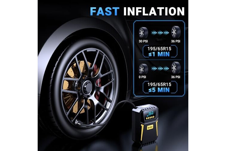 【Rapid inflation】: For tyres of size 195/65 R15, this car tyre inflator can raise the air pressure from 30 PSI to 36 PSI i...