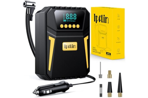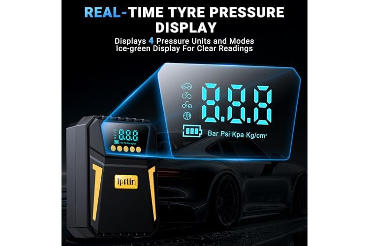【Digital Screen, Real-Time Pressure and Modes Display】:This Ipflin tyre inflator has a large digital screen that displays the real-time pressure of the tyre and the mode of inflation, giving you an accurate and intuitive reading experience, the digital display readout avoids the reading error of the traditional dial tyre pumps; the ice-green display is different from the black-and-white font display, which is also able to be read clearly under strong light.