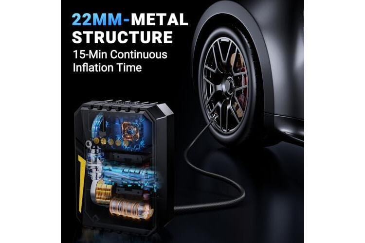 【Preset Tyre Pressure & Auto Shutoff】: You just need to start the engine, plug the cigarette lighter into the car's 12V power outlet, link the tyres, press the‘Switch button’to select the mode, and then press the‘+’and ‘-’buttons to preset the required pressure.When the Portable tyre inflator reaches the required pressure,the digital air compressor will automatically switch off, so you don't have to worry about over-inflation.
