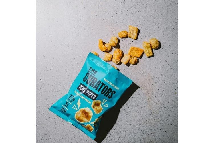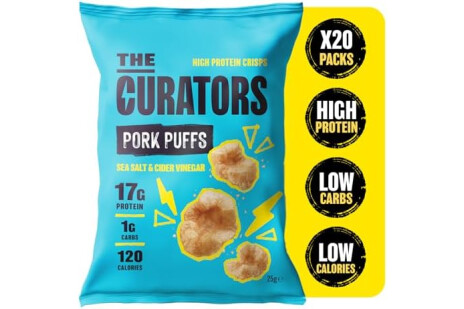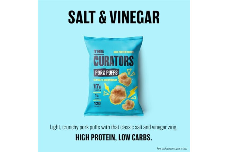THE CURATORS High Protein Pork Puffs, Protein Crisp 25g (20 Packs) 17g Protein Low Carb Keto Gluten Free Savoury Snack (Salt & Vinegar)