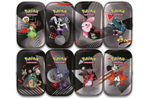 Pokemon Favorites in the Palm of Your Hand! In this Pokemon TCG: Unova Mini Tin, you'll find: 1 Pokemon TCG: Scarlet & Violet Black Bolt booster pack, 1 Pokemon TCG: Scarlet & Violet White Flare booster pack, 1 of 8 sticker cards showing the art from this Mini Tin, and A Pokemon art card showing the art from this Mini Tin- you can collect and combine all 8!