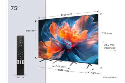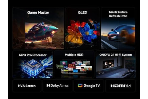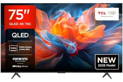 TCL 75T8C-UK 75" 4K 144Hz Gaming QLED Onkyo 2.1 Dolby Atmos Google TV with Dolby Vision & HDR 10+ BBC iPlayer (2025 New Model)