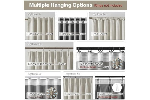 5 Hanging Options: 1,Back tab design 2,Rod pocket style 3, Clips rings hanging method 4, Contemporary Pleated Look 5, Utilize our hooks for effortless motion on Track System, or combine with your rings for seamless sliding on your curtain rod.Hanging this curtains adds vitality to your bedroom, living room, dining room, nursery, home Office, and sliding patio door etc.