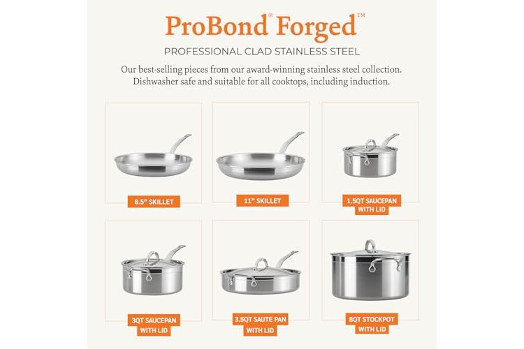 Set includes: 8.5" skillet, 11" skillet, 1.5qt saucepan with lid, 3qt saucepan with lid, 3.5qt saute pan with lid, 8qt stockpot with lid