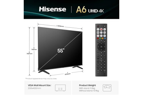 Hisense 55" 55A6QTUK 4K Ultra HD Smart TV AI TV - 4K UHD, Hi-View AI Engine, Precision Colour, AI Smooth Motion, Sports Mode with Freely, Disney +, YouTube, Netflix