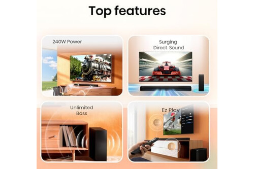 [240W Max Audio Power] 240W ultra-high power amplifies every detail, whether it's the dramatic effect of a movie, or the pulse-pounding intensity of a game, all bringing you a theater-level experience.