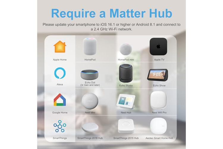 For Apple users: iOS/iPadOS 16.1 (or later versions), 2.4 GHz Wi-Fi, and a compatible hub such as Apple TV 4K (2nd or 3rd generation) or HomePod Mini are required.