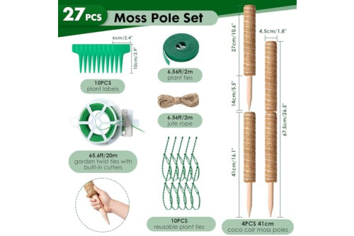 27PCS Moss Pole Set: The moss poles for monstera includes 4pcs 41cm plant poles, 10pcs plant labels, 20m of garden twist ties with built-in cutters, 2m of jute rope, 2m plant ties and 10pcs reusable plant ties